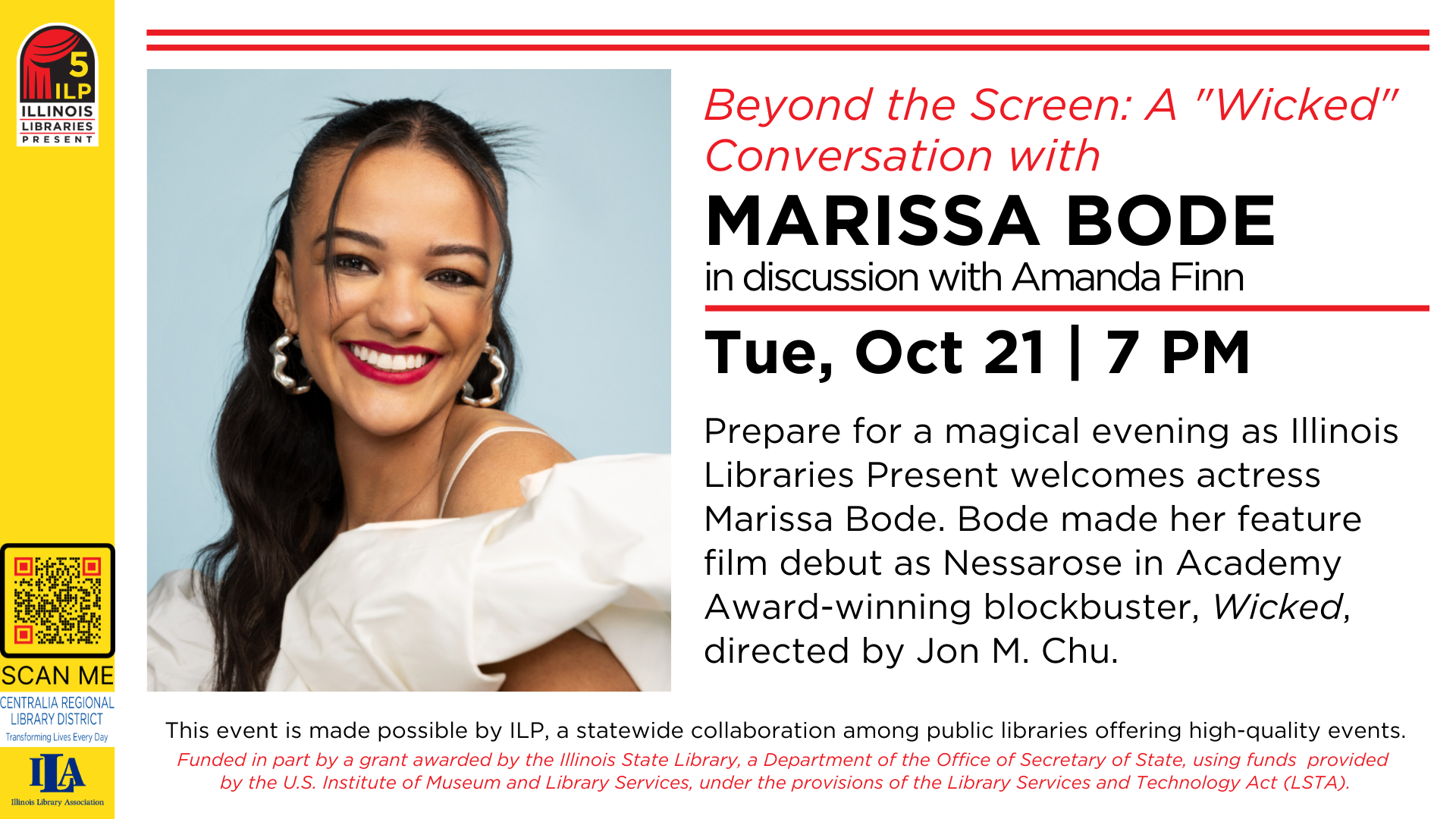 Prepare for a magical evening as Illinois Libraries Present welcomes actress Marissa Bode. Bode made her feature film debut as Nessarose in Academy Award-winning blockbuster, Wicked, directed by Jon M. Chu.